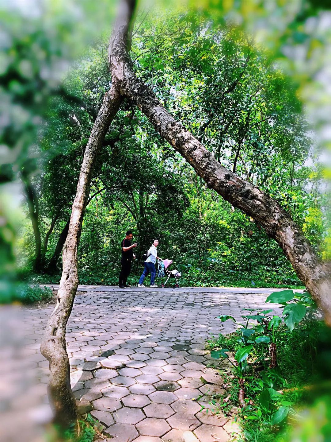 自从遇见这棵连理树,每次去天河公园,我都不忘去看看连理树,伴随着的是我心中隐隐有些仓皇的情绪。连理树就长在小道的中间,我总担心它会不会被挪走,被毁坏。说不定哪一天,也许就会不见了痕迹。所以,每次去天河公园,一见到这棵连理树,我总会舒一口气,在心中轻轻地说上一句——哦,你还在这里!