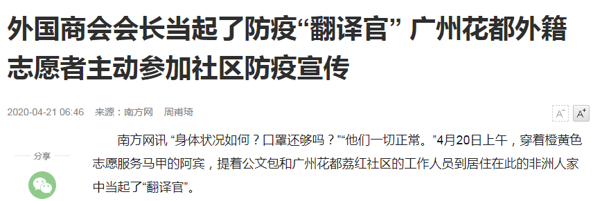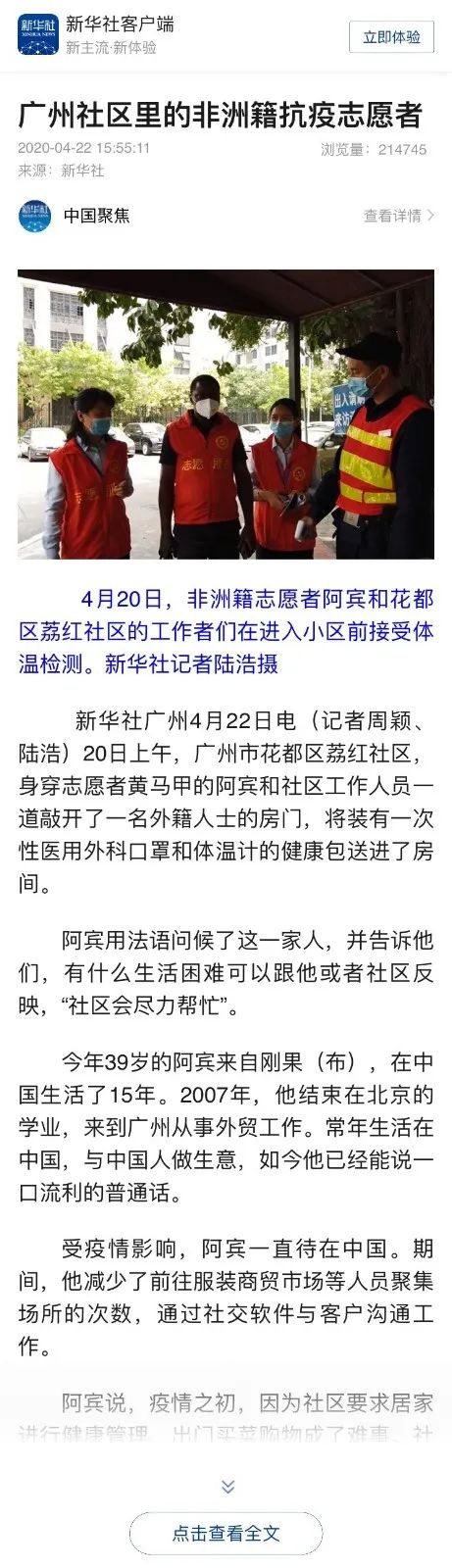 在疫情防控工作中,与外籍人员的沟通至关重要。连日来,在花都区秀全街荔红社区居住的非洲籍志愿者阿宾,主动参加社区防疫宣传,帮助同胞以及其他外国人士更好地在广州生活、工作。近日,该事迹受到新华社等多家媒体关注。