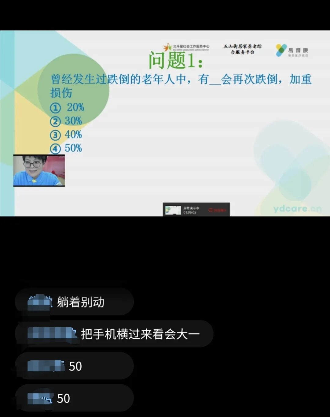 社工邀请专业医护人员开展知识讲解,如跌倒造成的危害、居家安全评估、跌倒后的处理方法等。期间,社工还根据微信群的互动情况发放小礼品,鼓励长者们积极发言,参与活动。