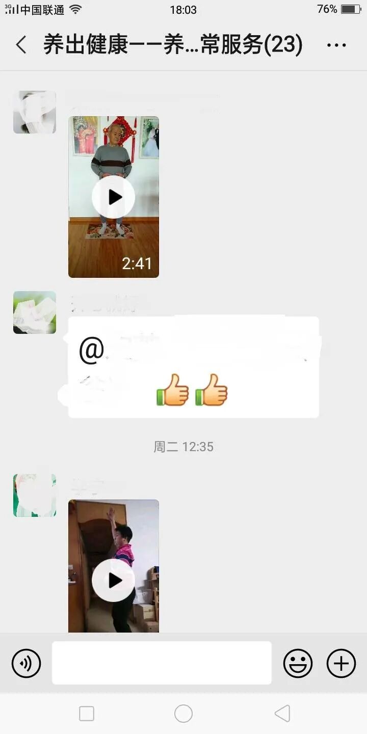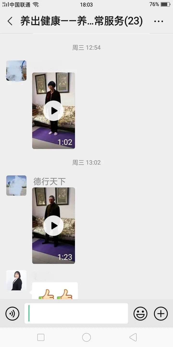 社工通过线上发布教学视频,长者们学习健身操然后以视频或者照片的形式记录下来分享至微信群。在练习健康养生操的过程中,长者们既锻炼了身体,也增添了宅家的乐趣。