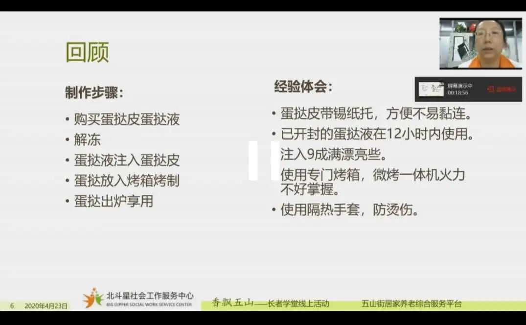 据了解,此次长者“云课堂”形式灵活,课堂内容丰富多彩,既有保健烹饪,又有摄影歌唱等相关教学视频。截至目前,中心已经开展了5场线上教学,共有188人次参与其中。长者们体验网络“云课堂”带来的新潮,真正体现了“在家学习,共抗疫情”两不误。