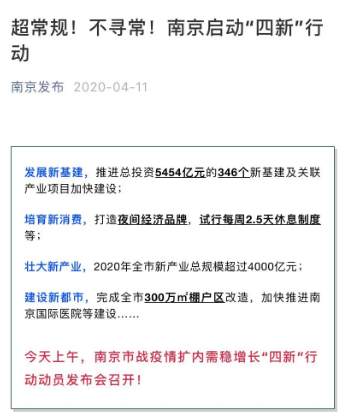 4月11日,南京市战疫情扩内需稳增长“四新”行动动员发布会召开,正式发布新基建、新消费、新产业、新都市四大行动计划。