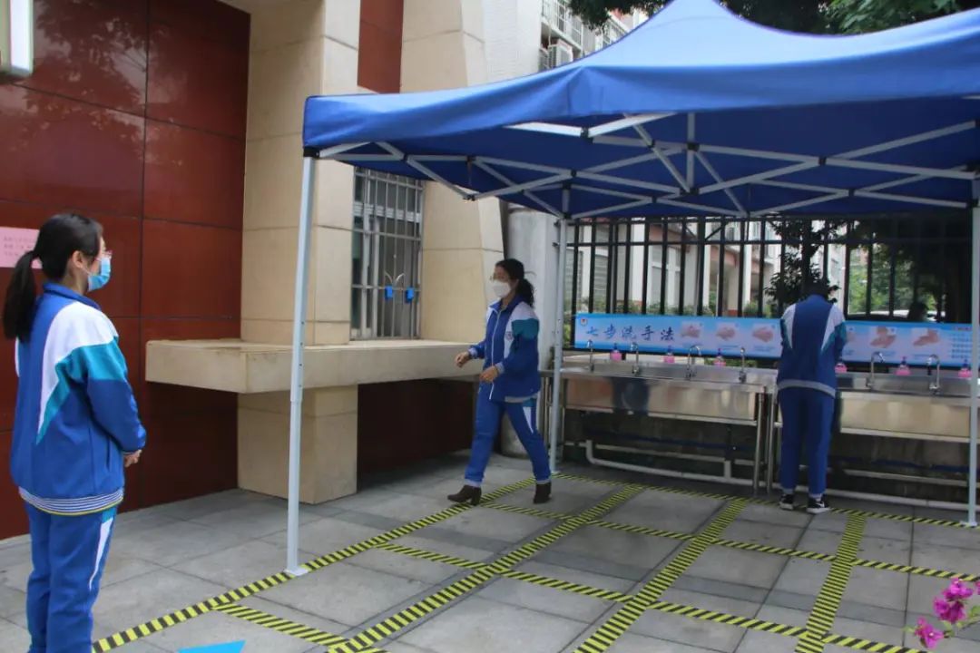 步行“学生”返校时,需先到校门右侧的洗手区,运用“七步洗手法”进行洗手。地上画了“九宫格”,提醒学生站在格内,与前后方保持距离。