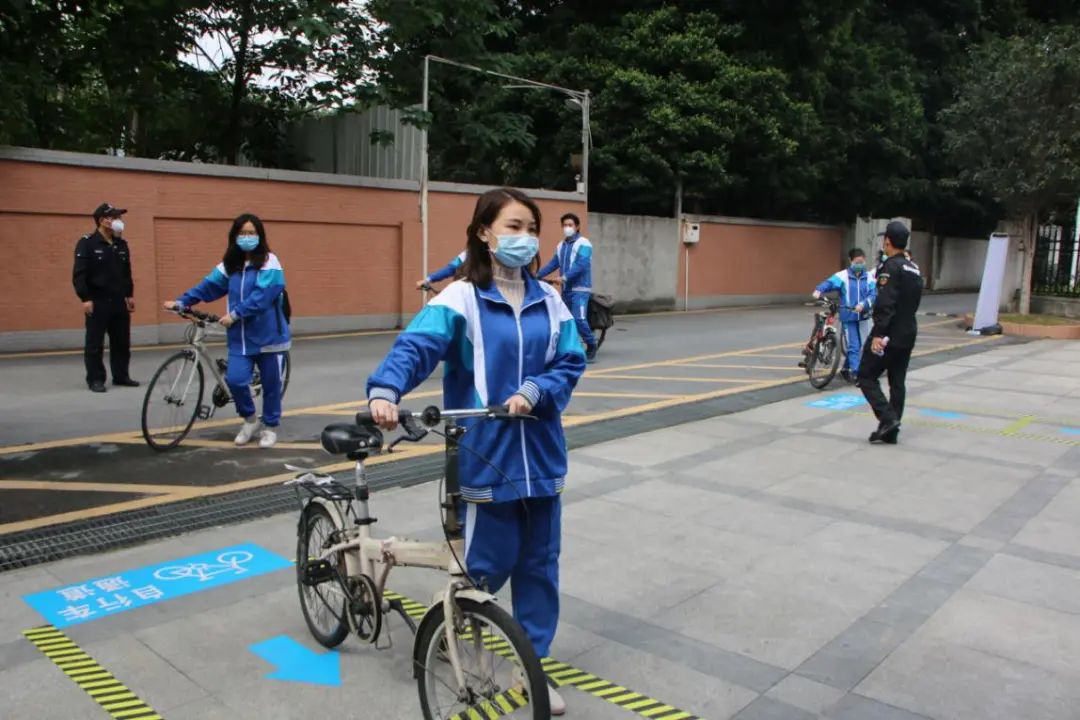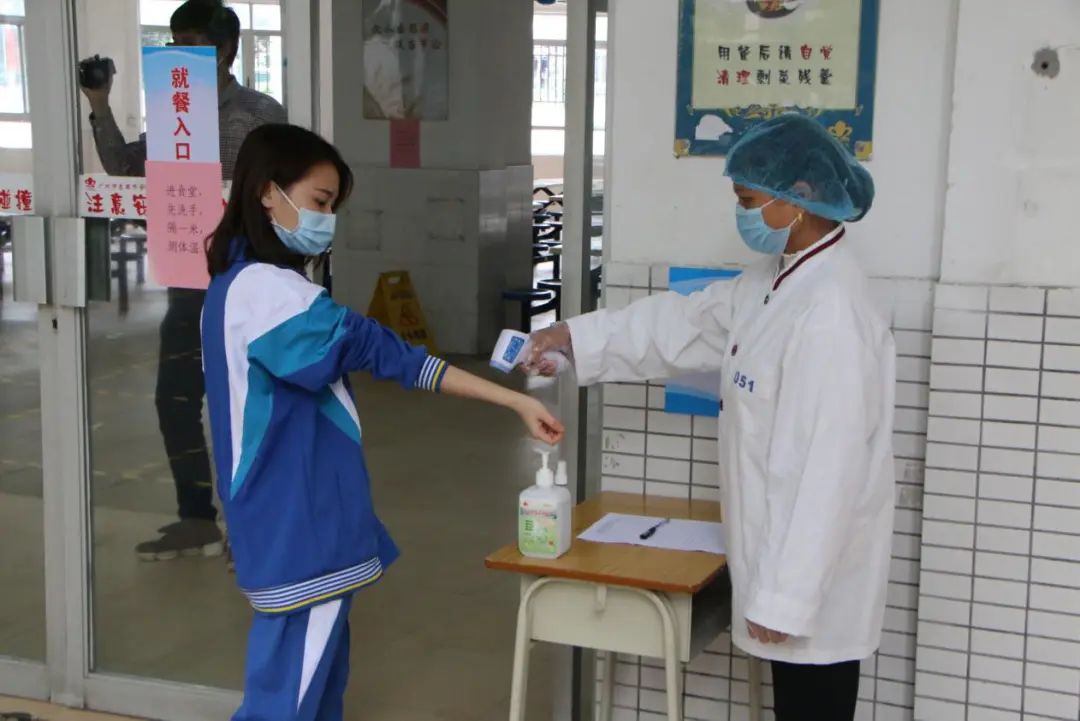 骑车学生进校时,也需间隔一米排队,体温测量后,保安或老师对其喷洒免洗洗手液。