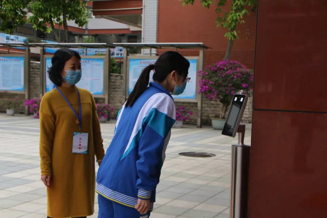 过了“人工关”,还要过一个“技术关”。学校安装了红外线测温设备,进行人脸识别测温。每位教职工和学生的资料已经录入红外线测温设备,以便及时上传对应体温信息。随后,“学生”才能进入校园。