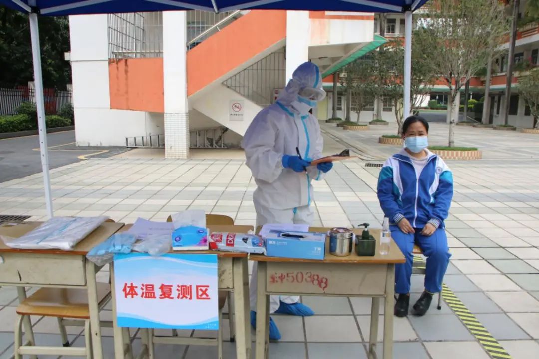 演练还加入了突发情况应急处置的场景。突然,一名“学生”被检测发现体温超过36.8℃,教师把其带至复测点,由校医进一步检查。