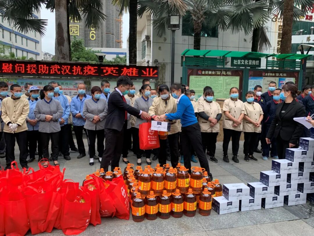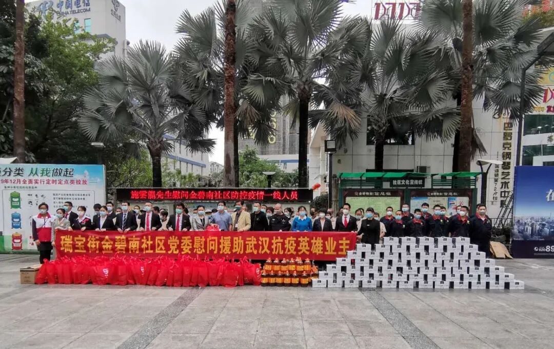 4月23日,一场暖心的战“疫”慰问活动在金碧南社区举行,爱心业主施云龙先生为驰援武汉归来的英雄医生罗旋、社区居委以及物业等疫情防控一线人员送上慰问物资。