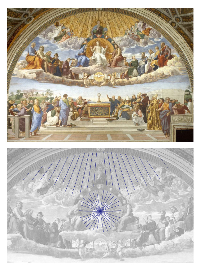 图2是拉斐尔的壁画:《圣礼之争》(创作于:1510-1511),对“光”的描绘带有某种具像化的装饰性。简单来说,如画面的弧顶,以及画面中心基督的形象背后,均采用以同一圆点为中心,从而绘制出四周扩散的直线,加之以采用金色颜料,这便是拉斐尔在此作品中“圣光”的表现手法。