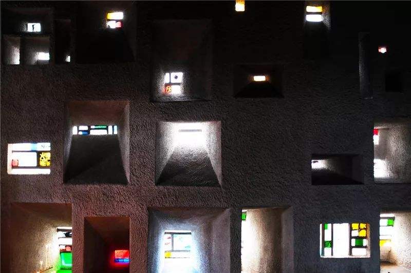 我们看到,这些窗户都似乎在释放“圣光”,尤其是柯布西耶似乎刻意把窗户设计得特别小,在教堂内昏暗的环境下,这些窗户的设计的确给予我漆黑中看见希望之感。这个设计的理念,与图1描绘光的方式如出一辙。我在想,柯布西耶做这个设计之前,是不是会给自己一个这样的心理暗示?