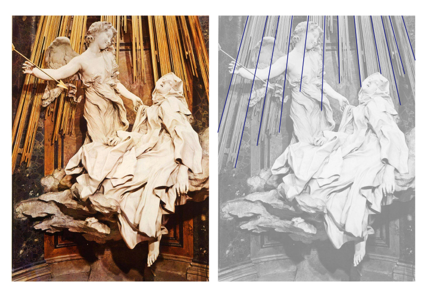 2.图3是贝尼尼的雕塑作品:《神志昏迷的圣德列萨》(创作于:1645–1652)中,“光”被处理成雕塑的背景,从图片中能够看