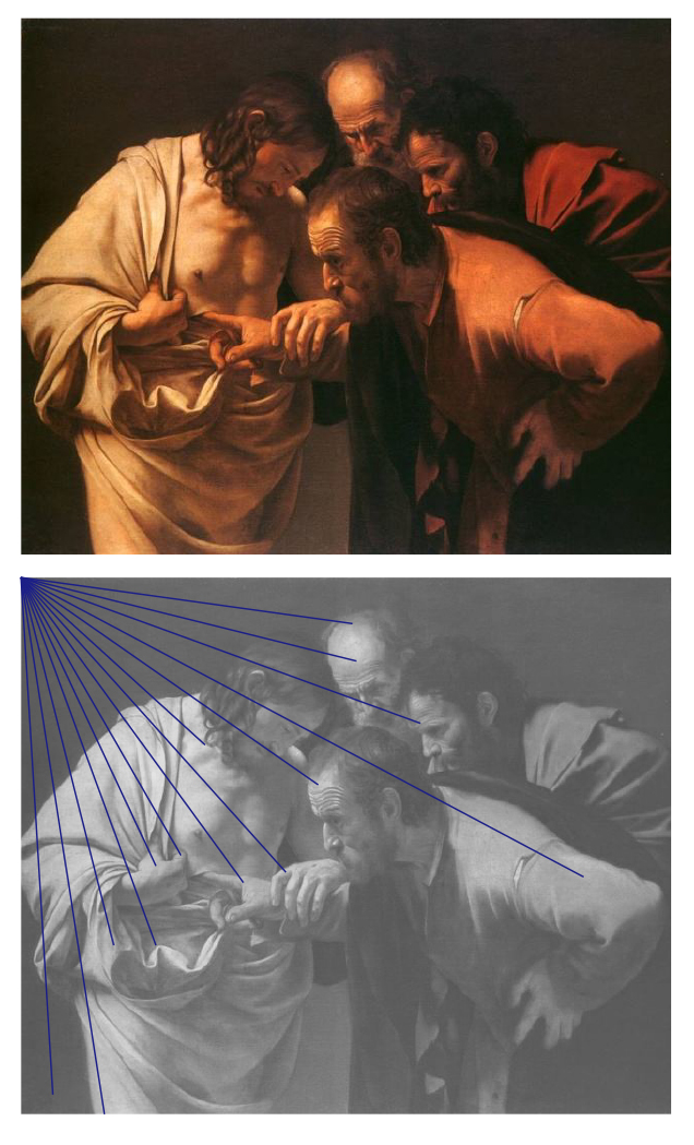 4.与《最后的晚餐》有同样巧妙处理的,图5是卡拉瓦乔的《多疑的多马》(创作于:1601–1602)。这张作品内容就是基督复活后,让多马触碰其伤口,让多马确认其已复活的故事。这张作品的基督头上同样没有光环,取而代之的是从画面外左上角向画心延伸的光线。