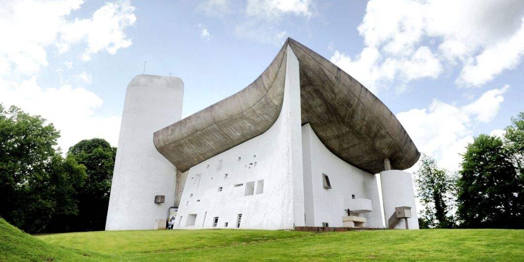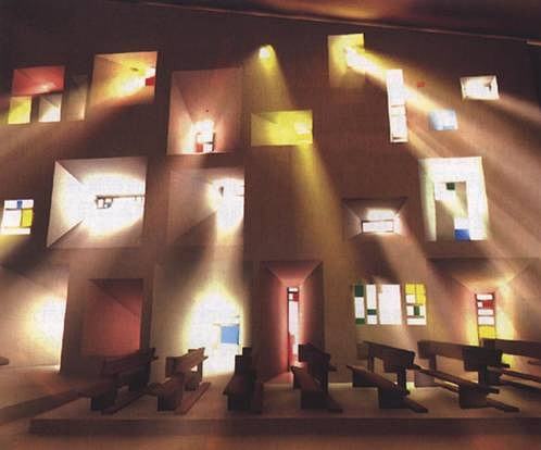 打开网页,输入这位仁兄的名字,第一项弹出来的是:朗香教堂。这便是柯布西耶的代表作。不难看出,朗香教堂与梵蒂冈的圣保罗大教堂不同。对于建筑设计,本人了解甚少。故此,什么这个采用中央十字式结构,那个采用自由化立面的专业术语我完全不懂。从这个外观犹如几个石膏几何体拼凑在一起的朗香教堂中,引起我注意的,是朗香教堂的“窗”,那些小气得可怜的“窗”——不规则地分布在其墙面上,犹如蒙特里安的冷抽象作品。这便让我提出一个疑问:“一座带有抽象观念的宗教建筑,如何达到让人们感受到直抵人心的神圣?”通过那些“窗”——从视觉艺术的角度——我找到了答案。