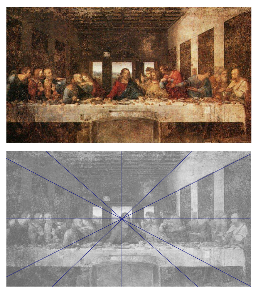 3.达芬奇的《最后的晚餐》(创作于:1494-1498)则以另一种方式呈现,比上面两张作品要复杂得多,但道理是相同的,如图4所示。值得一提的是,在大多数作品中,我们看见的圣母和基督头上都拥有一个光环,又或者是在头的周围绘制一圈阔散型的光线,这中作品网上随便搜。而《最后的晚餐》,巧妙地用到背景的自然光代替大多数作品中突兀的影响画面真实氛围的光线。