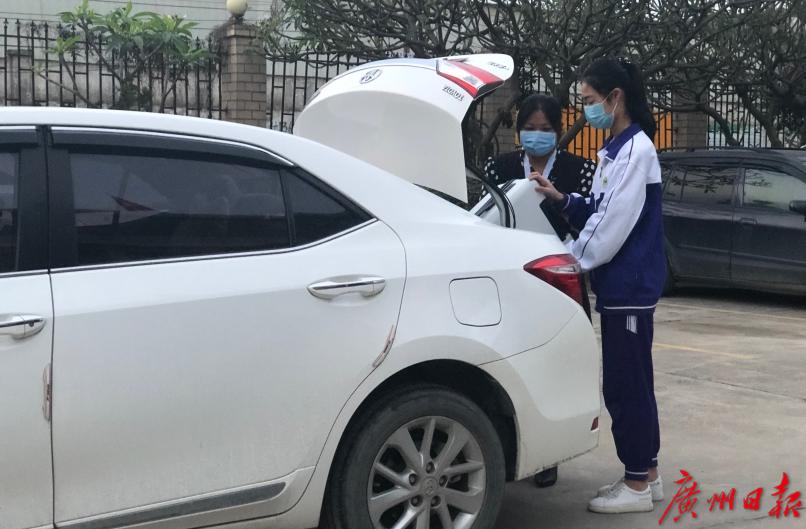 早上7点不到,白云区江高镇第65中学的老师已等在校门口迎接学生了。住宿生们行李多,老师们拉着板车帮大家运行李。65中学为学生返校设计了专门的进校路线,并在明德楼架空层下放置红外线测温仪,所有同学排队前后间隔一米进入学校,按照指定路线去测量体温。