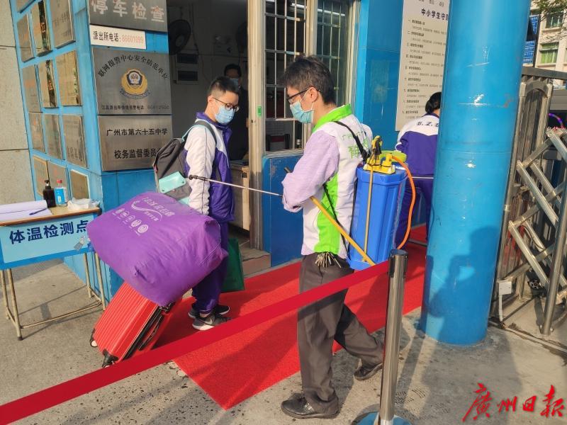 高三年级750名同学中,有724名学生是住宿生。学校安排了消杀工作人员在门口,学生的大件行李经过消毒才能入校。