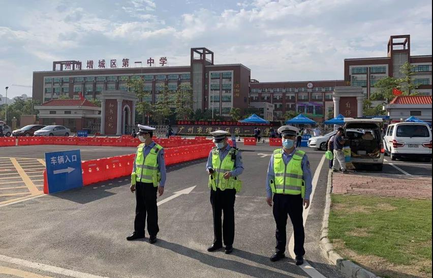 开学当日,增城区公安交警在增城中学、区第一中学、高级中学、新塘镇实验中学、新塘中学等全区各个中学门口,温馨嘱咐温暖着来往的家长和学生,并指挥送学生车辆按规定停放,提示学生、家长安全行走,确保高峰期学校周边道路交通秩序井然。