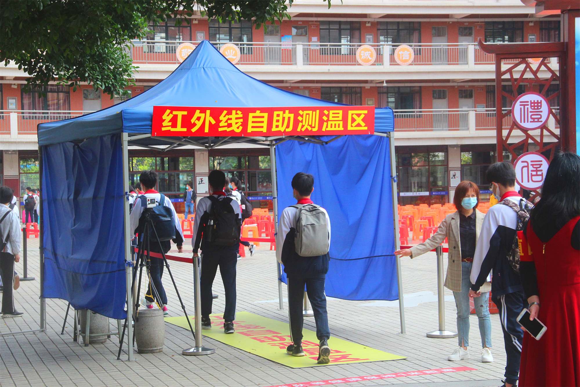 4月27日早上八点半,从化的高三和初三学生陆续返回学校。记者走进校园,需要先测试体温。硕大的校园,随处可见防疫的宣传标语,学校用警示带规划了师生入校路线,不时有老师提醒学生“不要扎堆,保持距离。”