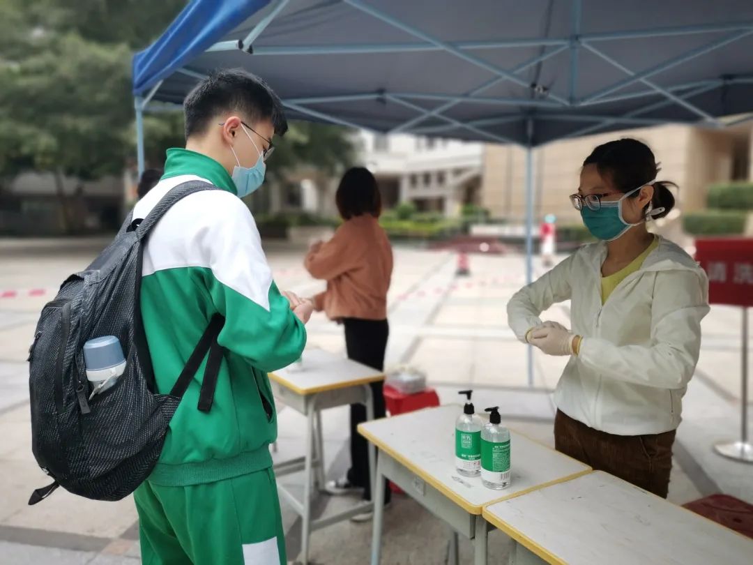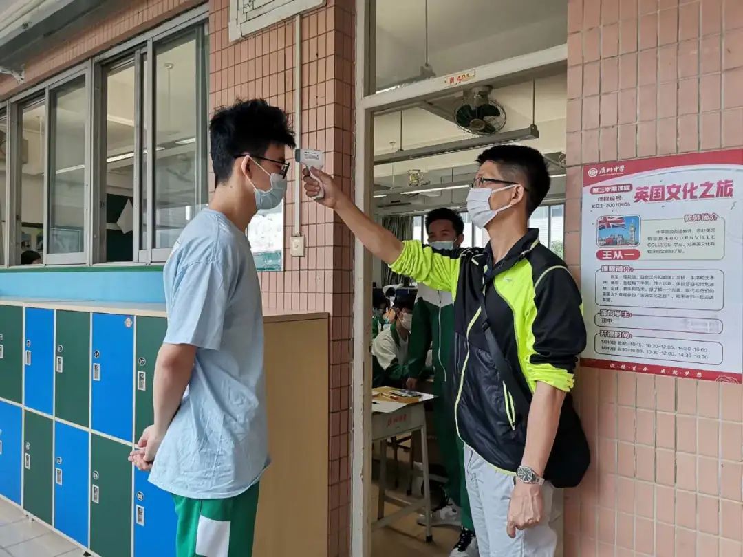 早上6:50,第一批学生在校门口有序排队,准备进入学校。学生需要通过一个架有红外线测温仪的通道,自动完成体温测量。然后,有四位值班老师现场指导同学们用免洗洗手液以七步洗手法洗手消毒,并检查同学们提供的穗康码健康信息等相关资料。