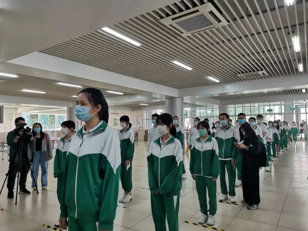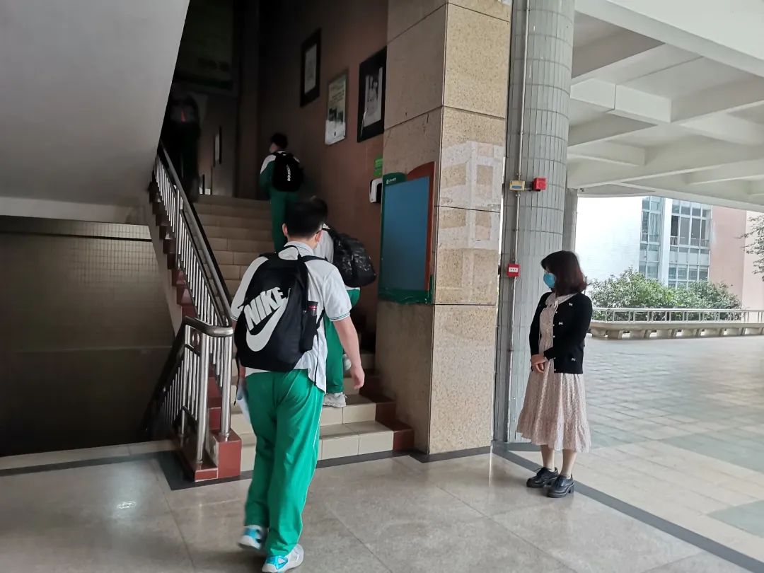 学生按课室分布,有序地从不同楼梯进入课室。初三学生返校十分激动。一名女同学表示:“很久没见到同学了,很开心!我的自律性比较差,在家上网课容易颓废。回到学校上课很期待,课堂效率会更高。”