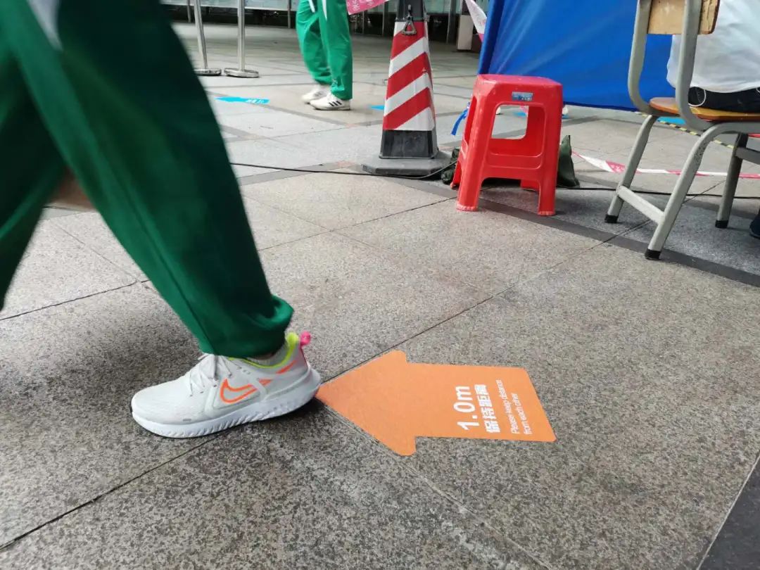 从校门口通往教学楼的沿途上都有老师提醒学生保持一米以上的间距。