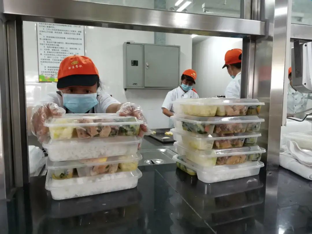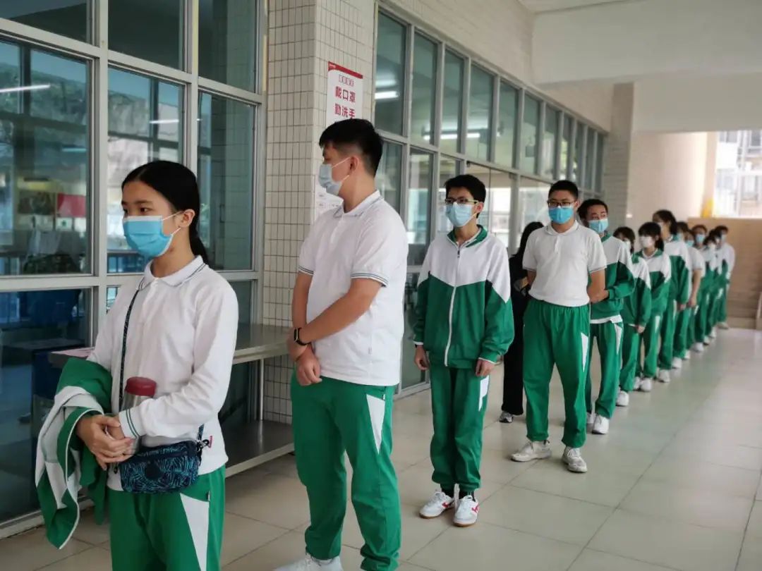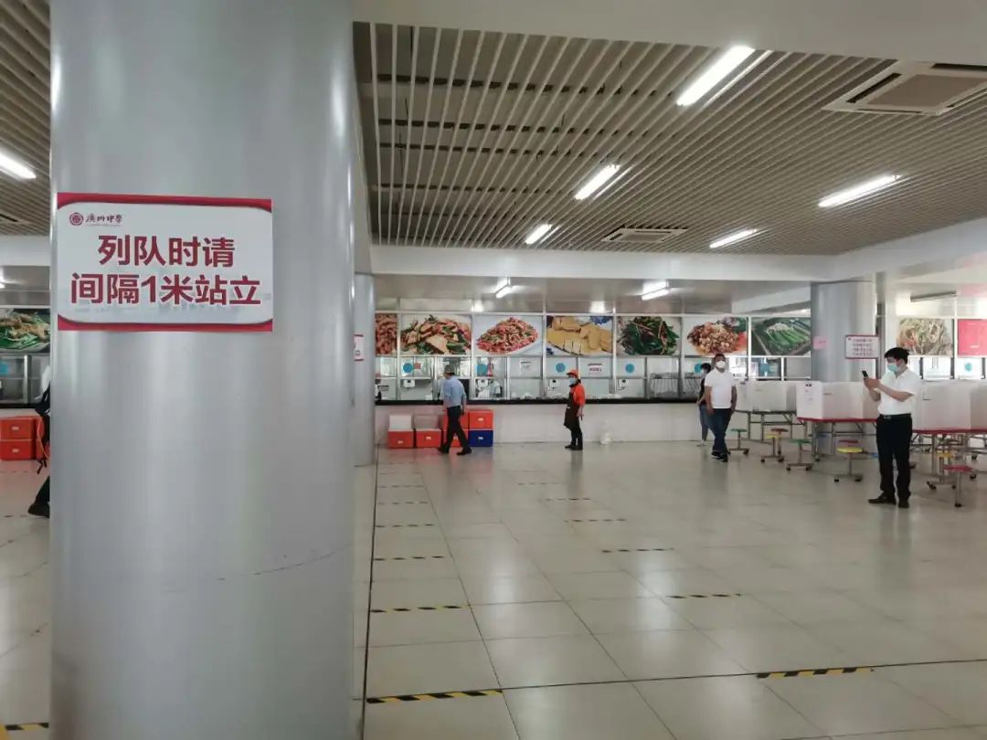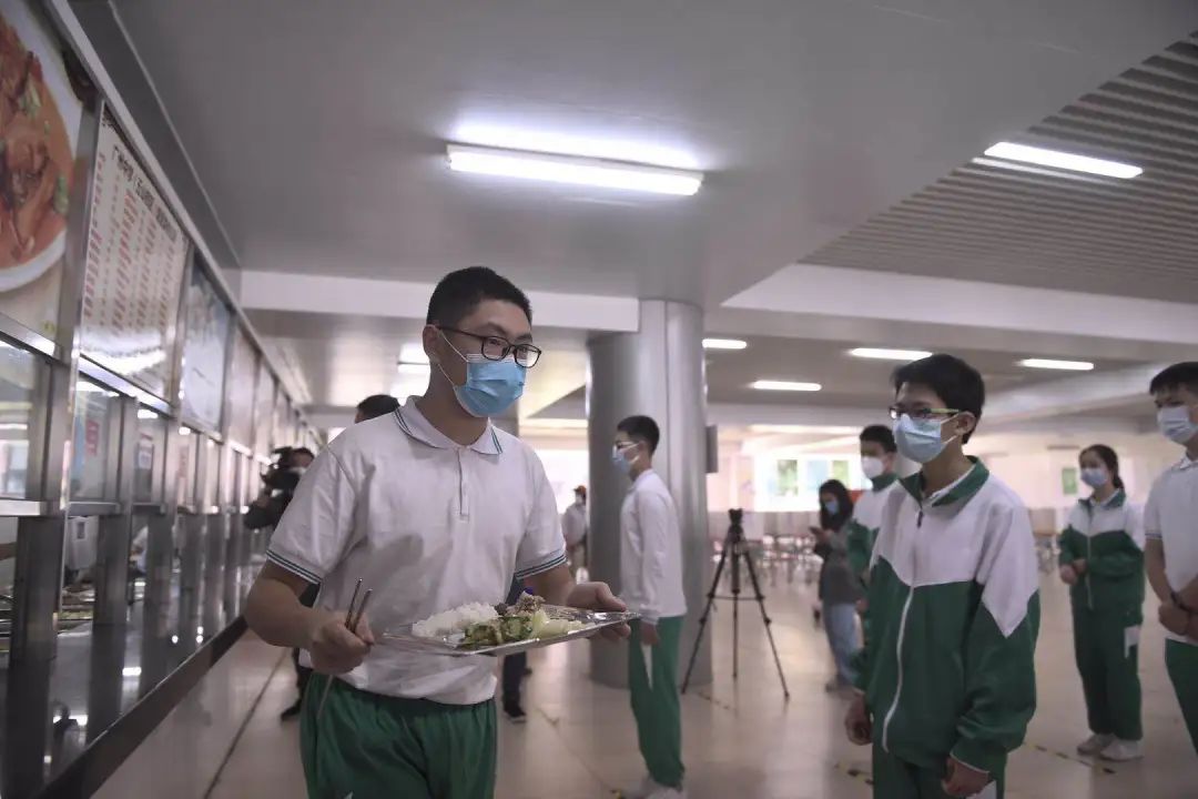 返校复课后,学校规定学生不能在校外就餐。高三学生的午餐由食堂工作人员直接送到各楼层,学生在课室中就餐。初三学生则分两批,以班级为单位有序排队到食堂就餐。