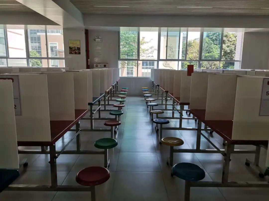 学校对食堂进行了“改造”,原来能供四人就餐的餐桌用隔板隔成了四个格子,两名同学可按对角线就坐用餐。为了缩短“堂食”同学选餐的时间,学校食堂每天准备了三个套餐供同学选择。每个套餐收费12元,费用也不再通过刷卡划扣,而是以班级为单位统一收取。今天中午的菜式有白切鸡、荷包蛋、黄瓜肉片、白菜等。在窗口取餐后,同学可通过学号找到自己的座位。按照规定,同学们需要在20分钟内完成用餐。