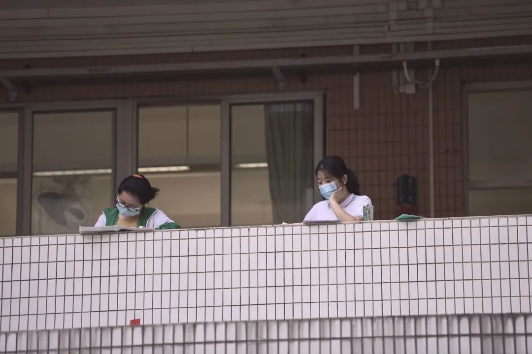 7点半左右,小e在高三教室门口看到,同学们安静地坐在教室里,拿出平板电脑和课本开始奋战了。相比初三学生,高三的同学对于返校更加淡定。据高三的一名老师介绍,高三未对原来班级进行拆班上课,而是将课室中的学生储物柜搬到走廊上,再将学生课桌间距拉大,以此来达到防疫对学生间距的要求。