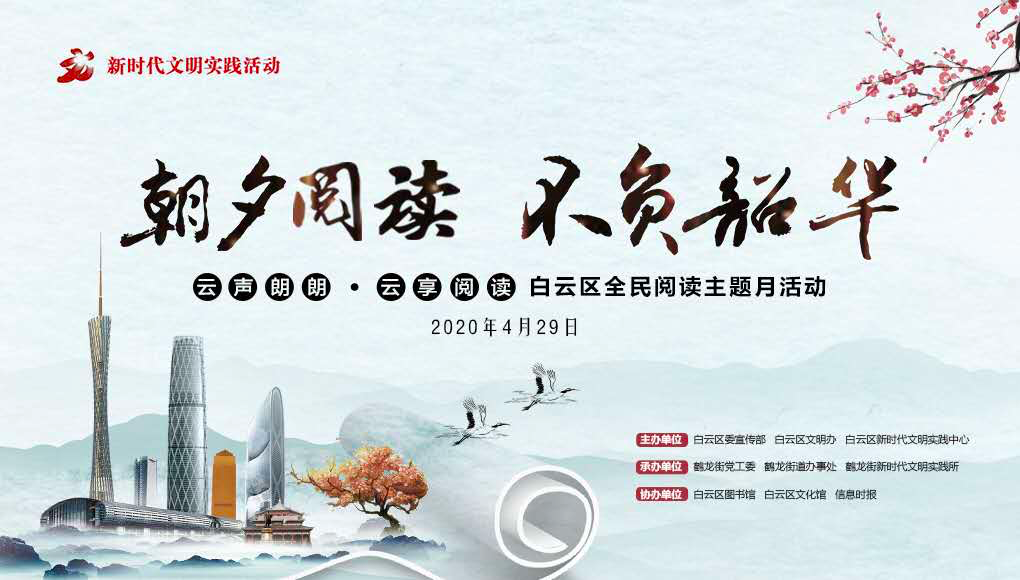 “云声朗朗 云享阅读”白云区全民阅读主题月活动“朝夕阅读·不负韶华”线上阅读分享会将于4月29日下午15:00~16:10在白云区鹤龙街新时代文明实践所举行,并将在“新花城”平台线上直播。