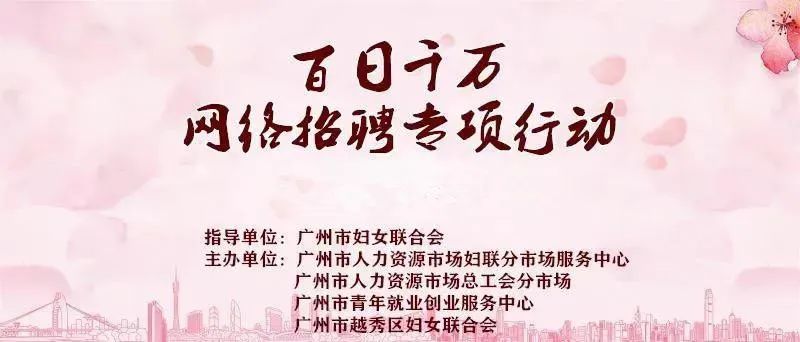为应对新冠肺炎疫情影响稳定就业,统筹推进疫情防控和经济社会发展工作,搭建人才市场供需对接网络平台,由广州市妇联指导,广州市人力资源市场妇联分市场服务中心、广州市人力资源市场总工会分市场、广州市青年就业创业服务中心、越秀区妇联联合举办“百日千万网络招聘专项行动”。