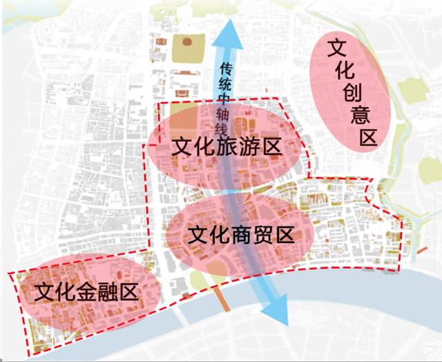 园区围绕北京路千年古城中轴,以“文化+”为主线,以融合为路径,着力打造 “区域开放、功能综合”的文化产业园区,逐步形成了“文化创意区、文化旅游区、文化商贸区、文化金融区”等四个特色鲜明、产业集聚的“一轴四区”产业空间布局。