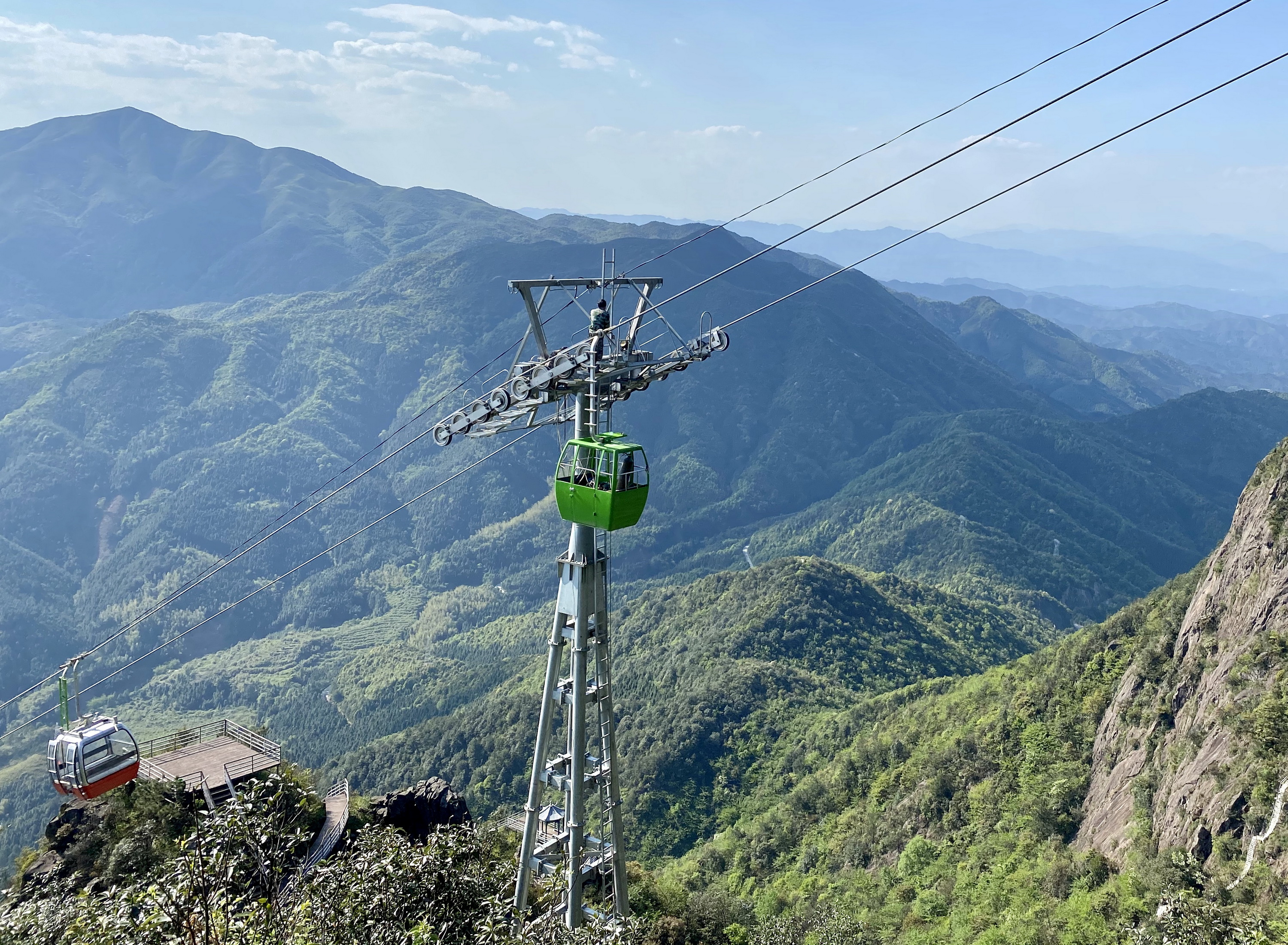 缆车测试开始了,电源一接通,索道开始运转,吊箱随着索道稳稳地向山顶运行。沿途越过金子山的险峰峻岭、森林竹海、峡谷飞瀑,梯田壮寨,头顶上的蓝天白云如同雪域高原美景。坐在缆车车箱里,一揽群山小,美丽的风景扑面而来映入眼帘,8分钟的时间,已经抵达上站,再步行几分钟,就可以挑战广东海拔最高的玻璃桥。