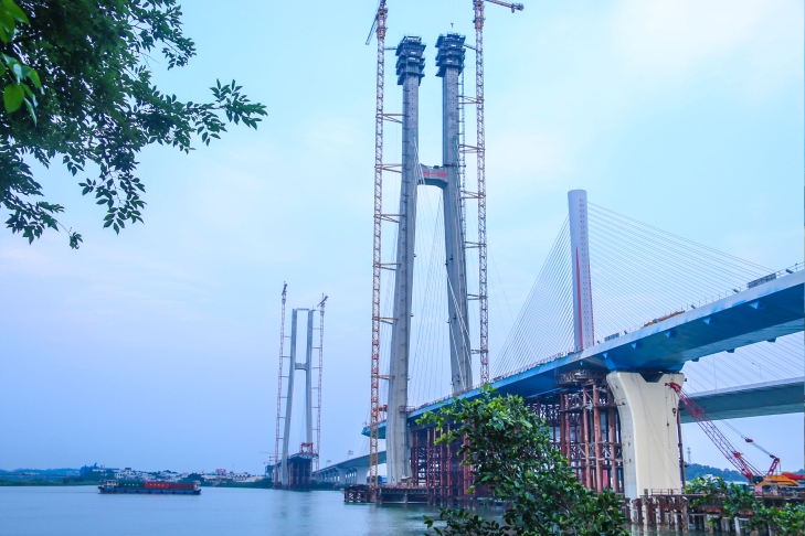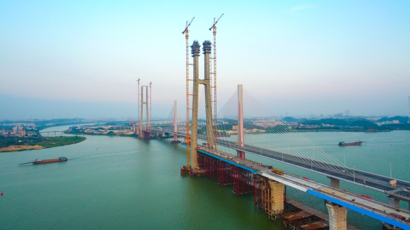 据了解,目前跨西江斜拉桥东岸157号主塔已完成封顶,钢箱梁施工至R10#节段。西岸156号主塔很快也将封顶,钢箱梁施工至L9#节段。两岸主塔96对斜拉索,已完成38对挂设施工。建成后将港口、公路、铁路连通,建立立体式运输网络,实现物流运输的革新,进一步推动降低物流成本,打通海铁联运“最后一公里”,发挥“海铁联运”“海公铁联运”的功能,创造出更好社会效应和经济效益,推动珠江流域作为“一带一路”桥头堡作用,为沿线国家及地区商贸往来提供服务,助力广州成为世界级铁路物流枢纽。