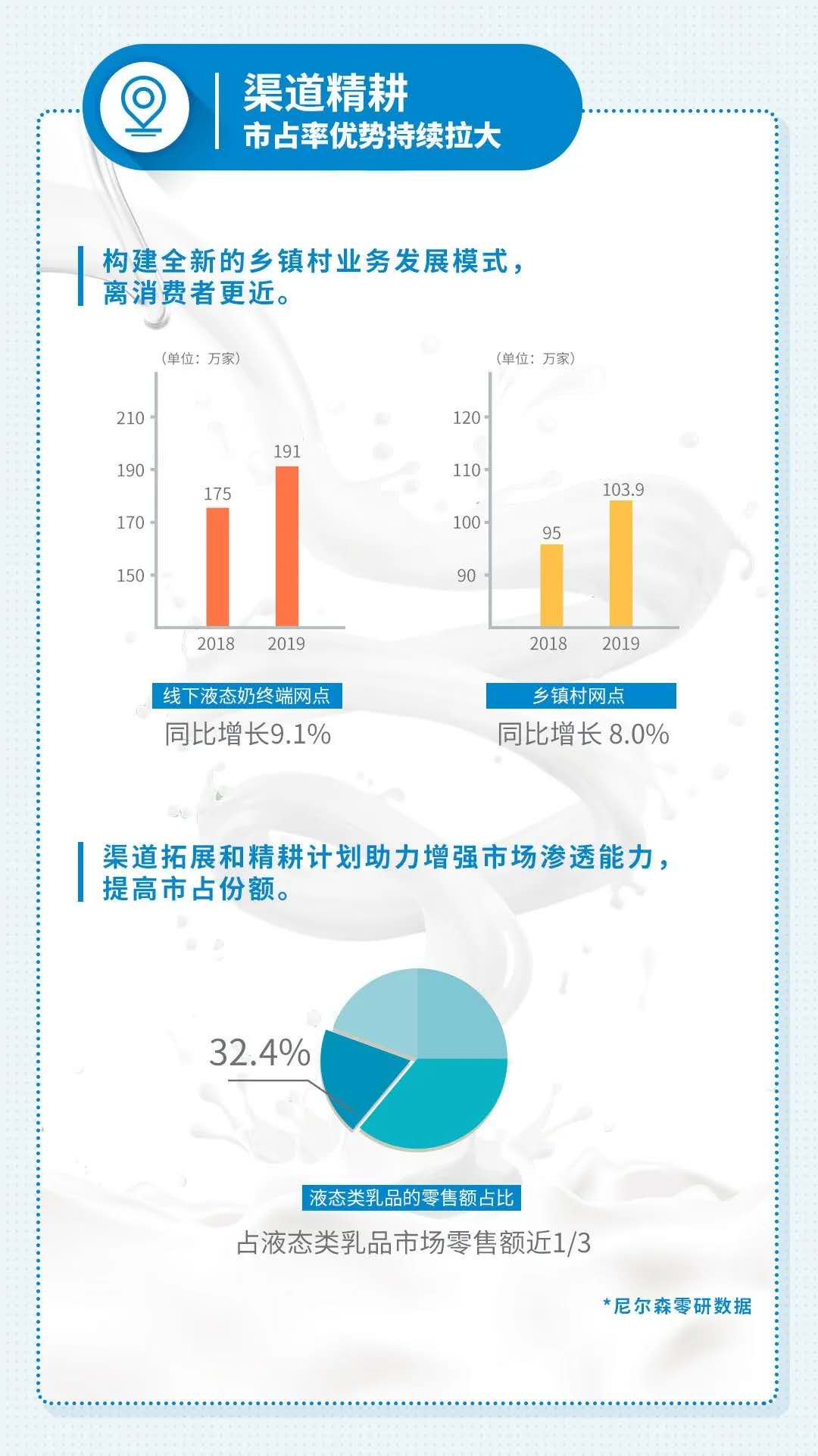 尼尔森零研数据显示,2019年伊利股份液态类乳品的零售额市占份额达到32.40%,同比提升1.2个百分点;婴幼儿配方奶粉零售额市占份额达到6%,同比提升0.4个百分点。截至2019年12月,伊利常温液态类乳品的市场渗透率为84.3%,同比提升1.9个百分点。