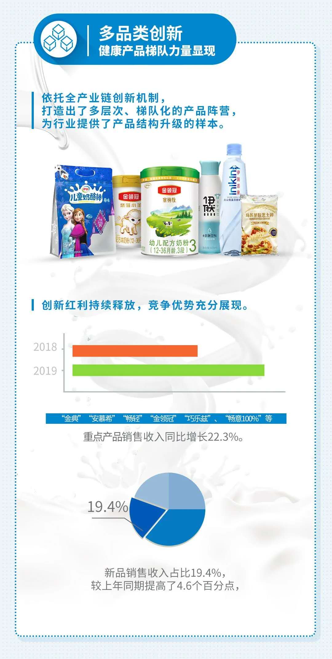 2019年,伊利“金典”“安慕希”“畅轻”“金领冠”“巧乐兹”“畅意100%”等重点产品销售收入增长22.3%。