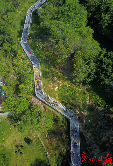 而连接花果山公园和越秀公园的步道依山而建,通过“人”字形的钢铁支架,将“云道”托在山腰半空中,“云道”犹如飘动的彩带,围绕着山体盘旋。市民游客行走其上,有如空中漫步,沿着绿油油的山坡行走,感受山体的自然落差,除了有丝丝刺激感之外,“空中漫步”的感觉令人非常惬意。