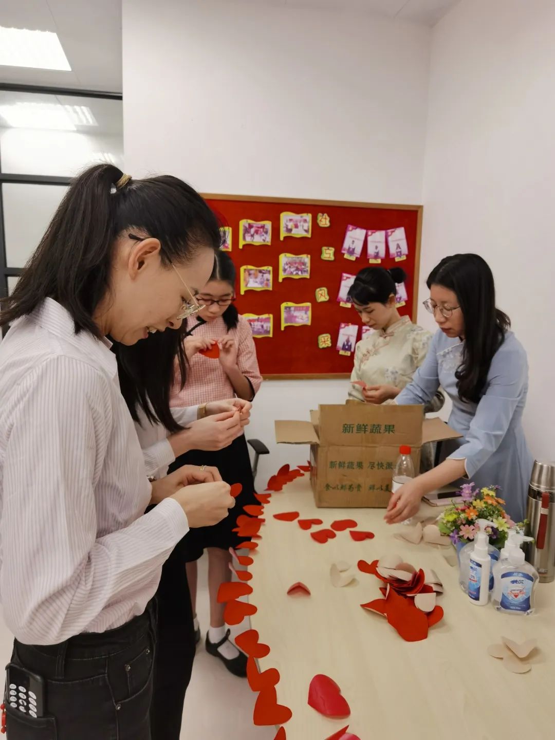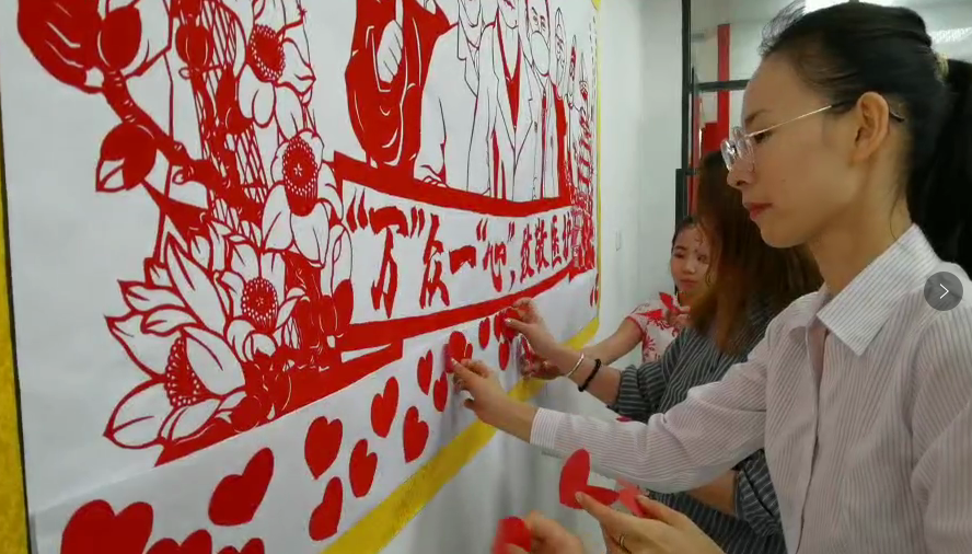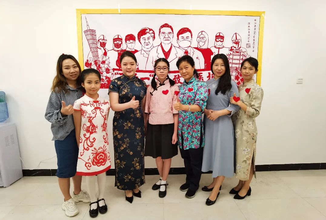 为体现万众一心中的“心”,练晓红还将她的学生们剪制的“小红心”剪纸,贴在作品的下方,寓意全国人民众志成城,万众一心抗疫的决心。