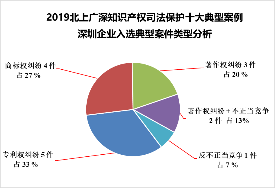 深圳企业入选的15个典型案例中,专利权纠纷案 5 件,商标权纠纷案 4 件(其中刑事案件2件),著作权纠纷案 3 件,著作权纠纷及不正当竞争案 2 件,反不正当竞争案 1 件。