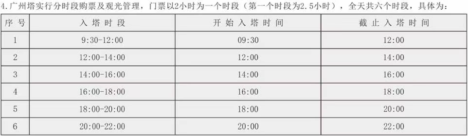 广州塔实行分时段观光游览,全天共六个时段,票厅仅可兑换当前入塔时段的门票,市民游客需要在门票有效入塔时段登塔。