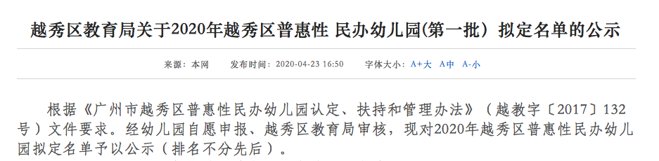 日前,越秀区教育局发布了2020年越秀区普惠性民办幼儿园(第一批)拟定名单。