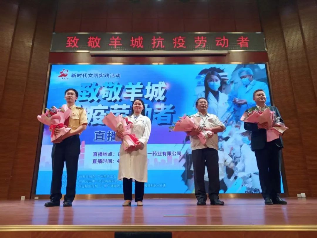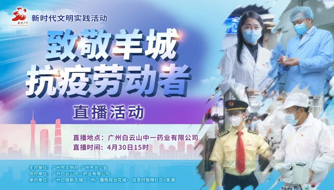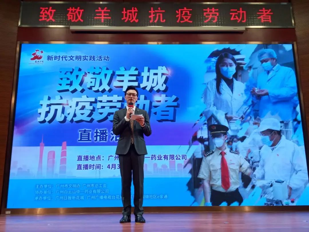 4月30日,在“五一”国际劳动节来临之际,广州市新时代文明实践活动之“致敬羊城抗‘疫’劳动者”主题活动在广州白云山中一药业有限公司举行。活动采取“云直播”的方式,邀请了羊城抗“疫”劳动者到直播间分享抗“疫”故事,向抗“疫”劳动者致敬。