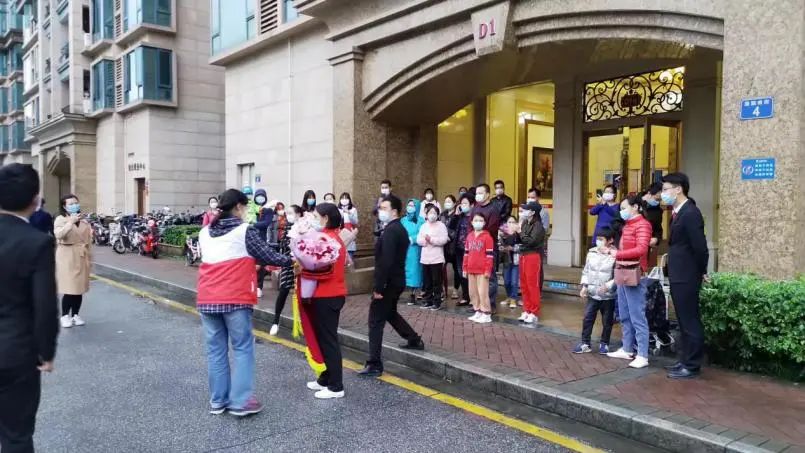 本月初,得知胡小姐结束休整即将回到家中的消息后,业主刘先生等20多名业主自发在大堂迎接她回家。这当中,不乏有小朋友。骏雅社区党总支党员代表、物业方均共同参与到这场温馨的欢迎仪式当中。