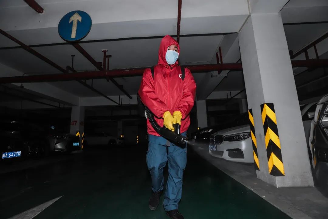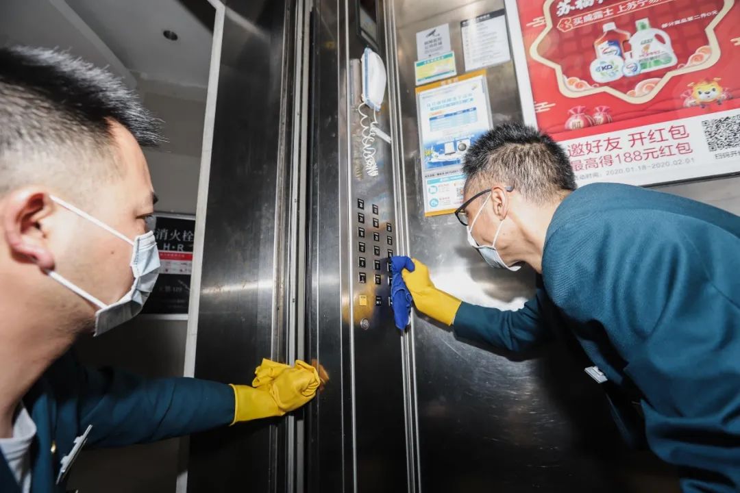 1月20日开始,物业管理处安排党员职工每天早、中、晚间在小区公共通道、大堂、电梯厅喷洒84消毒液,对每栋大堂门把手、电梯按键、电梯地面使用70%- 80%酒精或84消毒液擦拭,绝不放过任何一个重点部位。