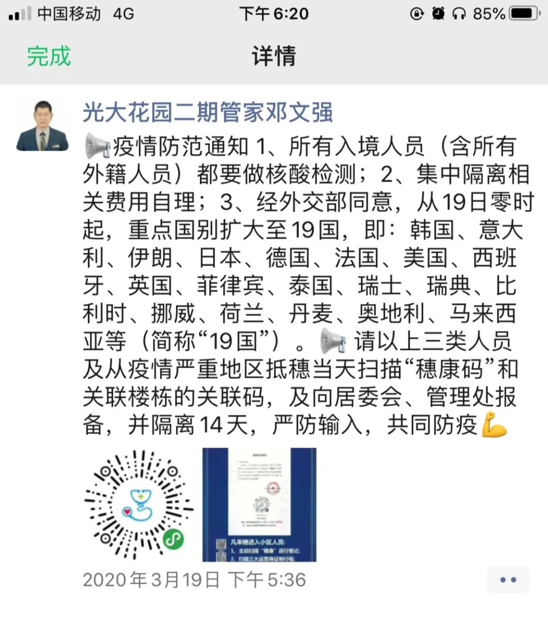 光大花园业主众多,疫情防控信息又需要及时发送给每一个人。杨冰介绍,管家们利用小区宣传栏、广播、微信、管家朋友圈、中海物业优你家APP等多种渠道加大健康教育宣传力度,在小区出入口、宣传栏、每一栋居民楼的大堂都张贴了疫情防控宣传海报,并添加了9000多户业主的微信,通过线上宣传,更快速地将最新的疫情信息告知业主。
