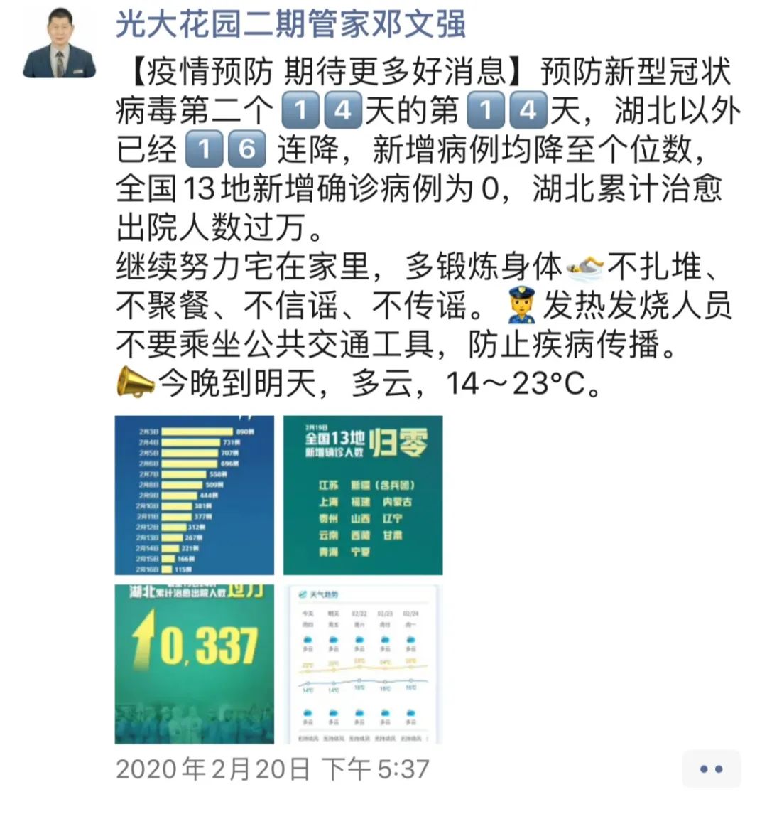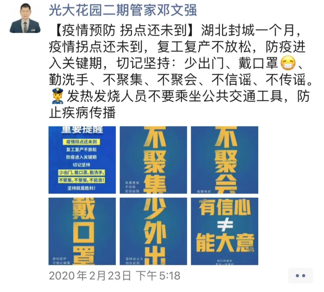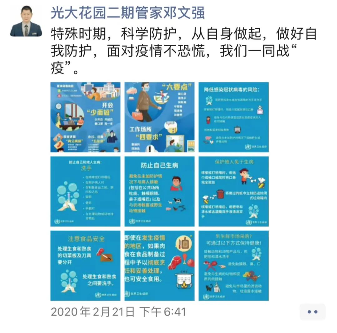 从1月23日开始,管家们还在朋友圈进行了连续28天的疫情防控宣传,每日推送全国、广州市、周边社区的疫情最新情况,呼吁业主们出门戴口罩、勤洗手、做好个人防护,通知从湖北等疫情严重地区返穗人员自我隔离。
