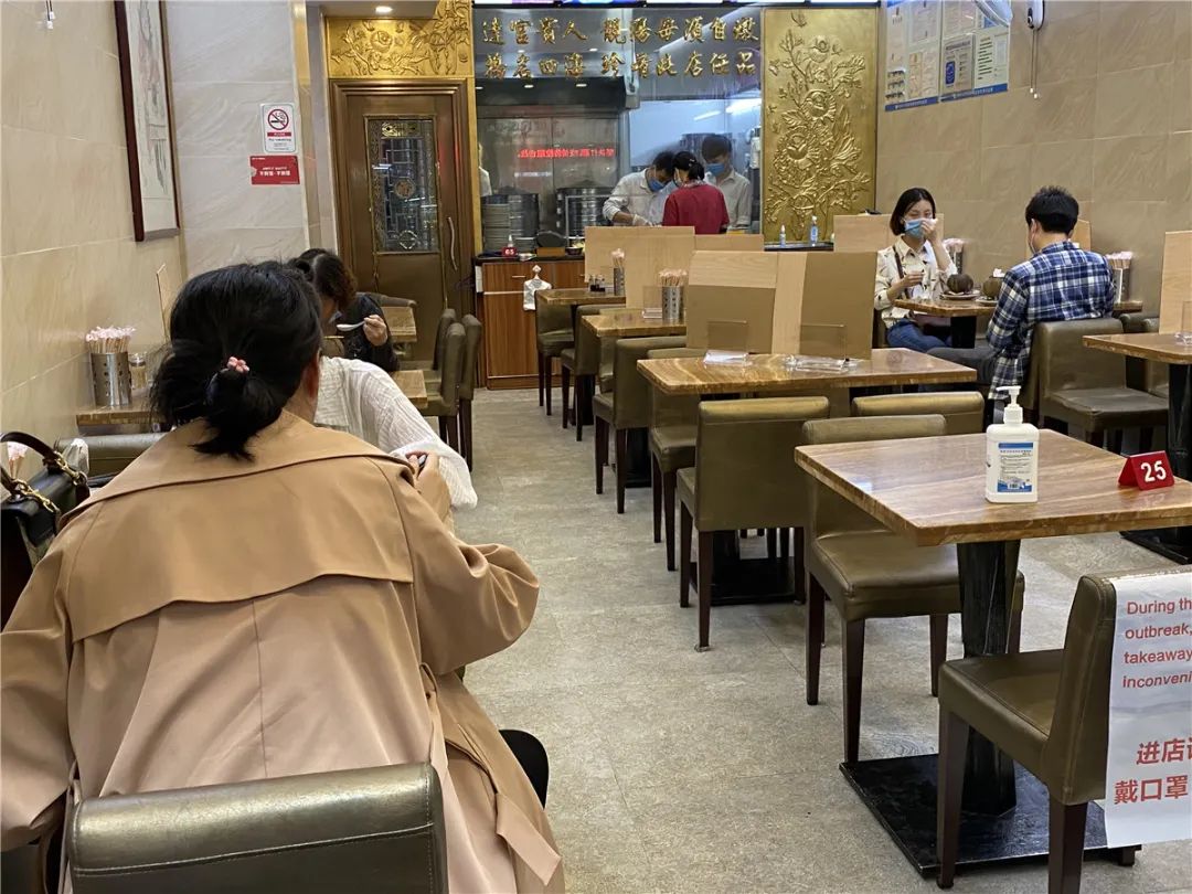随着复工复产的有序推进,越秀区大多数餐饮老字号也逐步开放堂食,严格按照越秀区餐饮指引,做好防疫工作,让食客吃得开心、吃得放心。达扬炖品店按照规定,用挡板将相邻座位隔开。前来位于德政南路的达扬炖品店堂食的街坊,需要经过体温测量,做好个人信息登记,按照规定隔座就餐。
