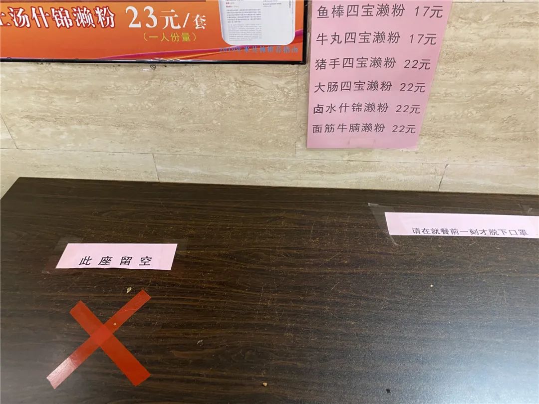老西关濑粉也在就餐桌子上贴上“此座留空”、“请在就餐前一刻才脱下口罩”等指引,提醒食客做好防疫措施。