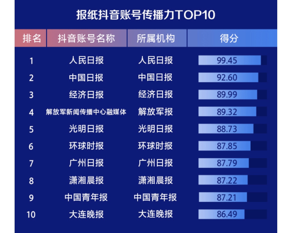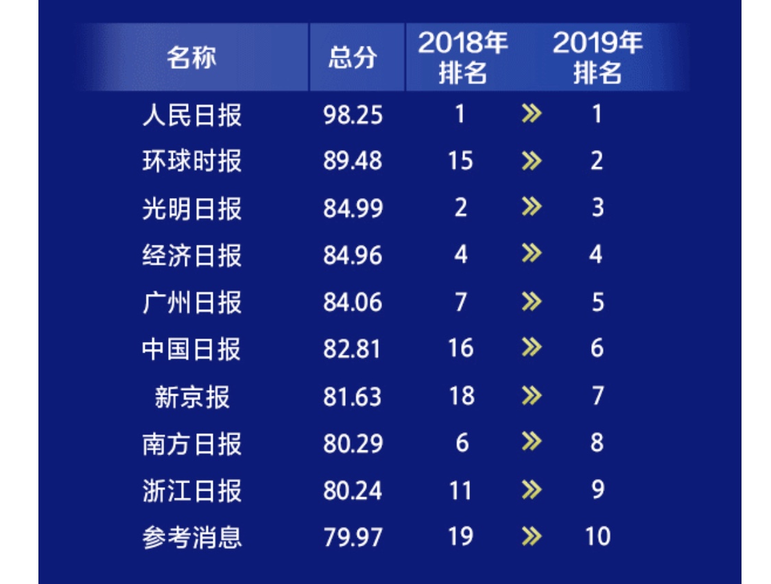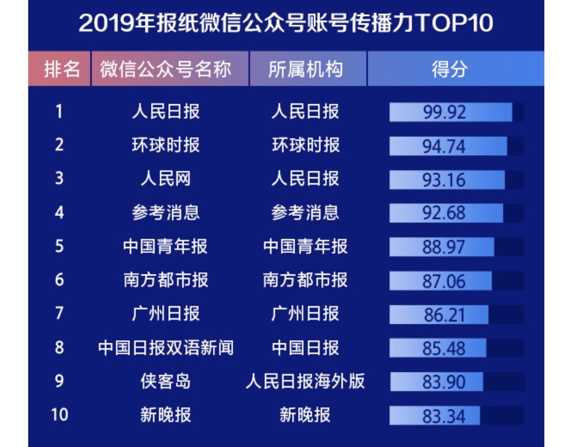 今日,由人民网主办的“2019中国媒体融合传播指数报告发布会”暨“中国媒体融合传播指数平台”上线仪式在北京举行,会上发布了《2019中国媒体融合传播指数报告》。报告显示,《广州日报》2019年融合传播力位居全国报纸前列,由上一年度的第7名上升到第5名,晋身全国五强,雄踞地方报纸第一位。同时,2019年报纸微信公众号账号传播力、报纸抖音账号传播力两大排行榜中,广州日报均排名全国第七位。