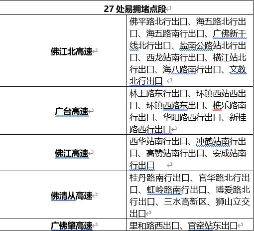 根据节前车辆出城行驶规律及近期车流量数据统计,预计佛山市域内高速可能出现车流缓行的站点有广明佛山罗格入口站、环镇西东行出口;佛江高速南水北行出口、高赞南行出口;佛清从桂丹北行出口;佛江北西龙北行入口等站点。