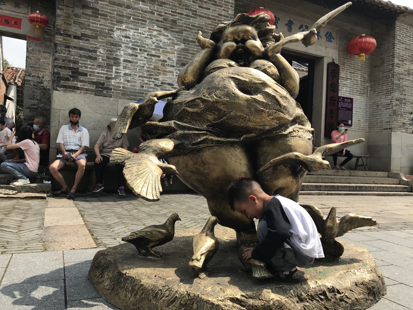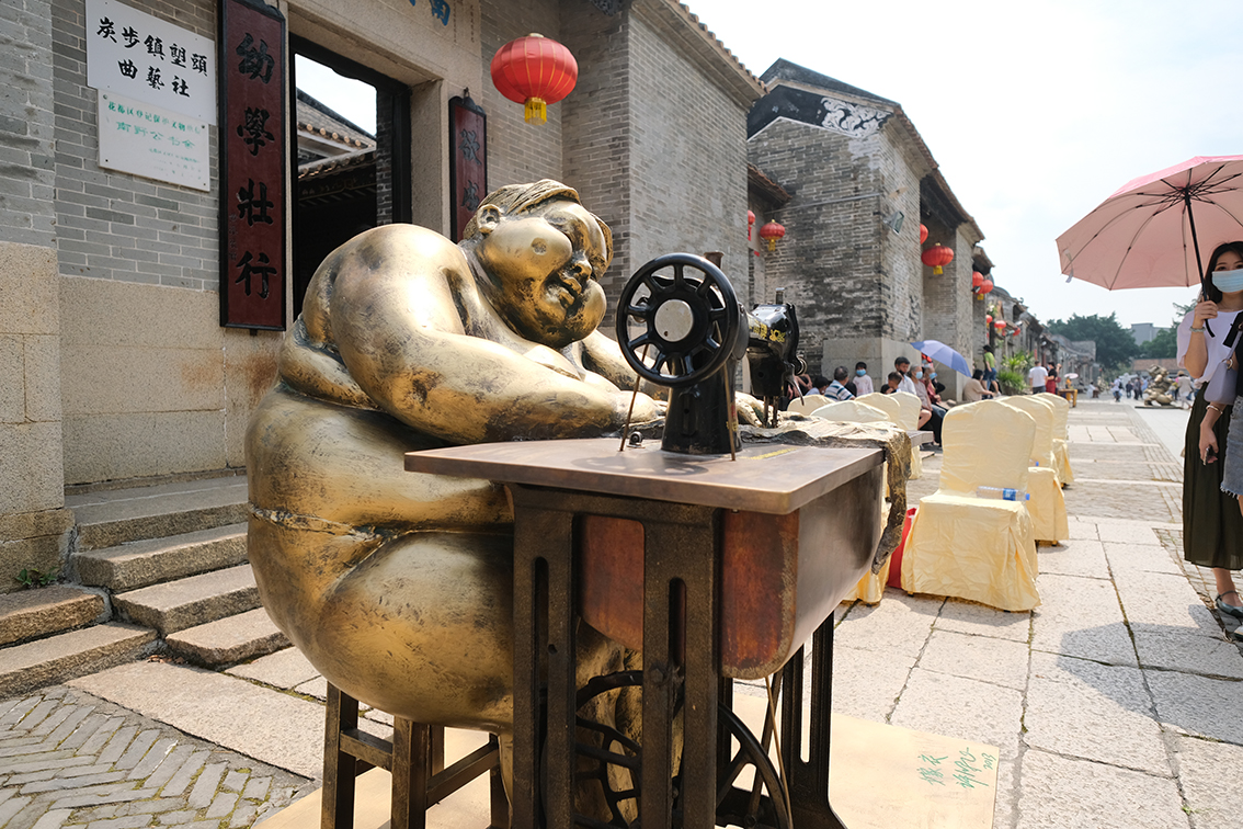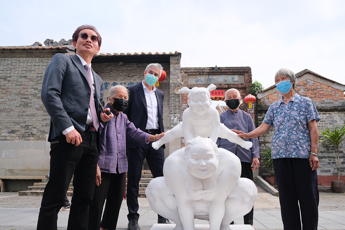 许鸿飞在雕塑在塱头古村引起了村民的好奇和兴趣,这种快乐、质朴的艺术感染力让村民一下融入其中,如同欢快的乡村音符在古老的古村田园中流淌,自然舒畅。