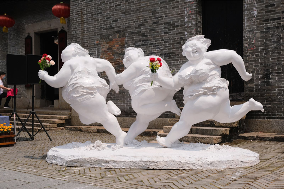 到大自然中感受艺术的魅力,眼前古村荷塘美景,呼吸清新的空气,感受“肥女”系列雕塑的独特感染力,具有穿越时空的梦幻感。许鸿飞雕塑所传达出快乐的艺术特质让两者在传统与现代的冲撞中融合,达到协调。